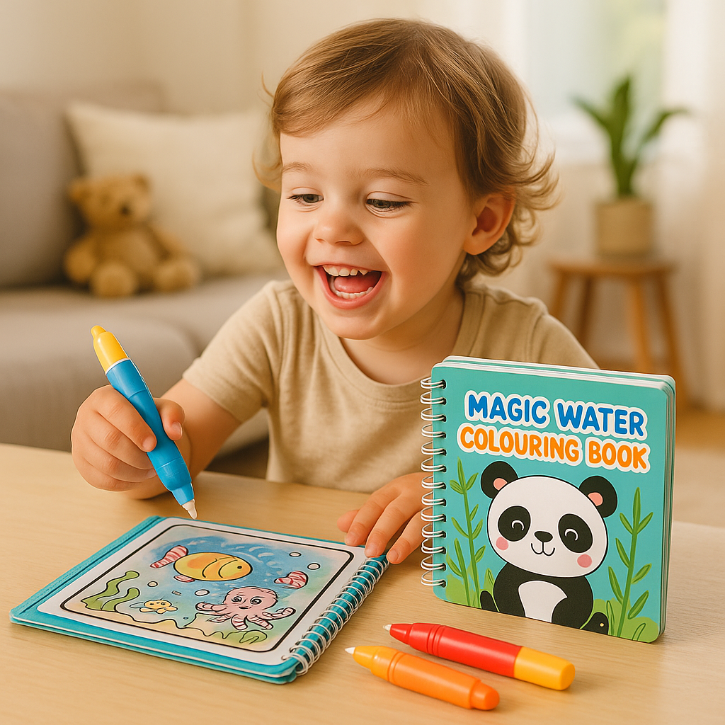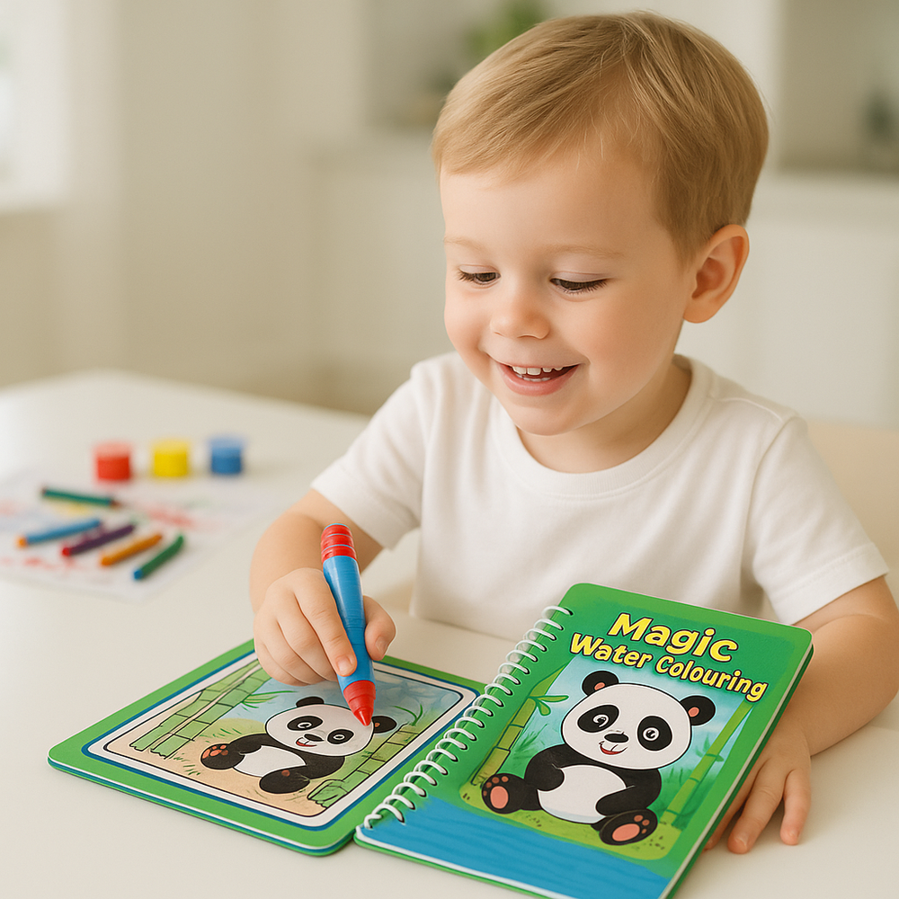 Designed for children aged 2β6. The chunky water pens are easy for tiny hands to grip, and the simple brush and reveal action works perfectly for toddlers still developing fine motor skills. Older kids love it too, they just get more detailed with their colouring